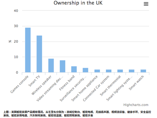 上图:英国智能家居产品拥有情况。从左至右分别为:游戏控制台、智能电视、无线扬声器、视频流设备、健身手环、安全监控系统、智能家用电器、汽车联网系统、智能恒温器、智能照明系统、智能手表
