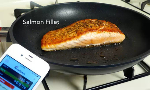 智能平底锅内置了一个传感器,通过蓝牙与智能手机进行连接,然后应用程序就能显示出锅的温度,它也会告诉用户,在何时翻转食物,肉应该切多厚、完美的温度以及烹饪时间等,接下来应该做什么完全无需担心。