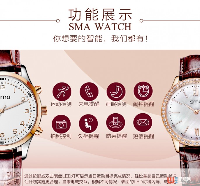 但是不要以为Sma Watch只有这些。经过将近一年的研发,Sma Watch智能手表不仅具备一般智能手表的睡眠监测、计步功能、来电提醒等,还独特研发了可配对互动的功能。男女对表配对即可随意表达“我爱你”或者“快来找我”等爱情密语。突破了以往智能手表冰冷生硬的形象,带有情感温度,重在以物传情。当你想表达想念或示爱的时候,男表长按功能(上)两秒以上,配对女表会发生感应,震动,LED灯闪烁520.男表回应闪烁520表示成功。让你的爱不受距离、时间限制。