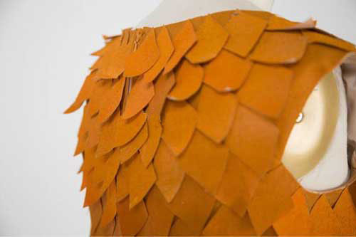 当光照发生变化时,衣服内置的 arduino 微传感器就会将信号传至伺服马达,使其马力增大或减小。如果光线太暗的话,马力就会增大,然后拉拽透明管中的钢丝,从而使树叶紧贴在身上,就像自行车闸的原理一样。而光线太强的话,温度升高,蜡就会融化,树叶一面压力就会变大,从而使树叶从衣服上脱落下来。服装的颜色取自落叶的颜色,并使用渐变的方式喷涂在一大张薄纱上,然后用激光切割机将其裁成树叶形状的连续图案,最后再用热熔蜡将其分别粘在一件棉料底衣上。
