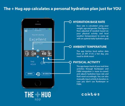 据The Hug创始人Panu透露,他本身是一位健身爱好者,但经常感到疲乏、力不从心,他无法找出其中的原因,不过他的女朋友认为可能是因为他自己本身喝水不够,而实际情况也正是如此。在戒掉了喝咖啡的习惯改成喝水后,他发现自己更加具有活力——即使没有咖啡因也是如此。他马上意识到,其他人也可能正遭遇着与脱水相关的一系列问题,包括皮肤干燥、紧张、心情不好,甚至肾结石等,因此想到了推出The Hug的想法。
