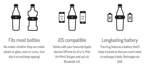 The Hug由白色的环带和支持iOS手机的App组成,为用户指导最佳摄水量。它的工作原理是通过小环内置的传感器与IOS设备连接(iPhone4s/5/5s,iPad mini第三代和更新版本,iPod Touch5和更新版本),这个小环通过水瓶的姿态来判断用户是否在喝水,然后通过自创算法测量使用该瓶的液体摄入量,并将数据交给智能手机上的App,给出何时喝水,喝多少水的建议,最后把实际喝水量给记录下来,看你一天是否达到补水标准。