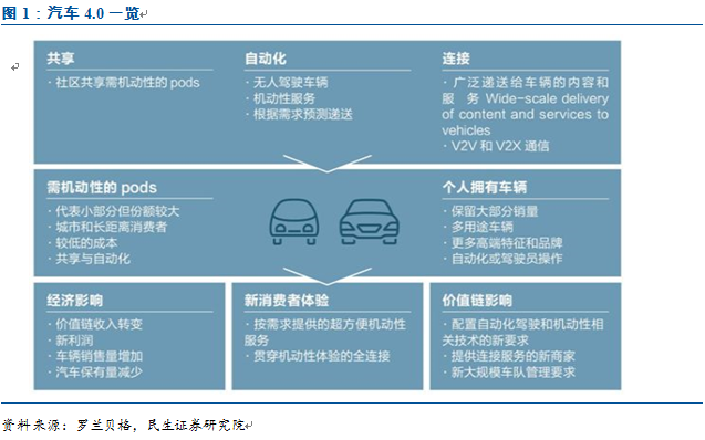 汽车4.0智能化时代,产业生态系统将重构。汽车4.0时代是由德国“工业4.0”概念延伸得来,从工业3.0到工业4.0时代标志着自动化向智能化时代的迈进,2014年中德签署了《中德合作行动纲要》,明确双方将就“工业4.0”加强合作。中国作为汽车制造大国,市场一致认为“工业4.0”概念最早将应用于汽车行业。根据罗兰贝格的分析,汽车信息互联、机动共享概念与全自动驾驶技术三大趋势将相互作用形成合力,一举把汽车工业推入4.0智能时代。