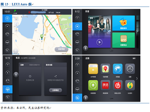 乐视LEUI Auto版是一款车载系统,一种是ROM(搭配一套三星平板电脑),一种是手机App(搭配OBD设备)。2015年,乐视发布LEUI Auto版,一款汽车内使用的操作系统,可以安装在平板电脑、车载导航仪和车载中控系统内,主要实现的是车机中的娱乐和导航功能。LeUI Auto左侧是固定的1+5方式,其中1代表系统时间,5分别代表:网络地图(基于高德地图)、影音功能(本地音频/视频、酷我音乐、豆瓣电台、乐视影视)、电话(基于通讯SIM卡)、车况(违章查询/后续OBD设备)、应用(文件管理、设置、浏览器、系统更新)。