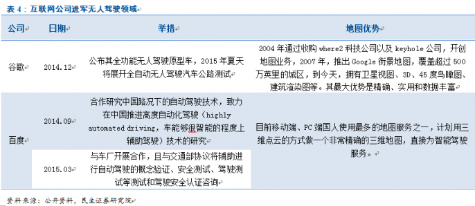 谷歌与百度基于地图等方面的原有优势,主动进军无人驾驶。无人驾驶产品和技术主要包括识别技术、决策技术和控制技术三个方面,切入无人驾驶领域的互联网公司以谷歌和百度为代表,由于无人驾驶的数据依赖于高精度地图,通过传感器对道路信息进行获取整合,通过信息处理运算做出反应,达到车辆自动行驶的目的,谷歌和百度基于在地图等方面的原有优势,主动进军汽车领域的无人驾驶方向。