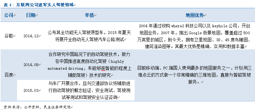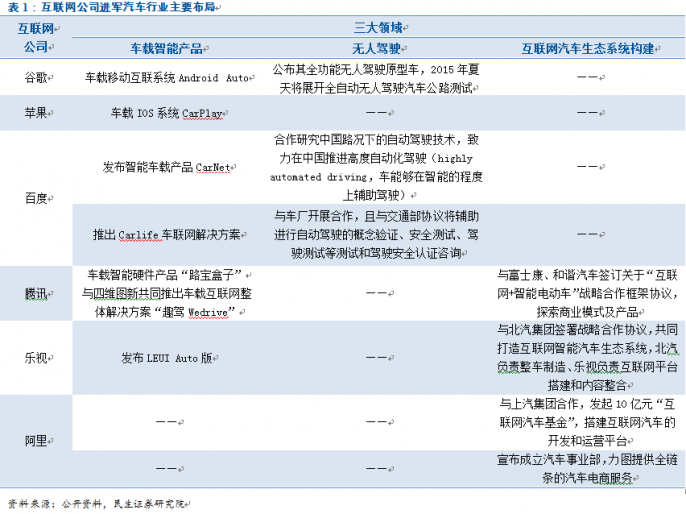 互联网公司成为进军汽车行业的先发力量,加快汽车智能化步伐。互联网的革命性发展对传统制造业产生巨大的冲击,在汽车4.0智能化的时代,互联网公司争前恐后的涌入这一领域。从国外的谷歌、苹果到国内的BAT三巨头以及乐视等互联网公司,都欲要大施拳脚。