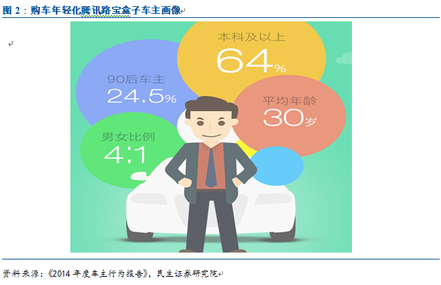 80、90后成为购车主力,追求个性、互联与智能。汽车的智能化趋势不仅是汽车工业转型升级这一国家意志的体现和国家层面政策的推动,汽车消费群体的重大变化也是推动汽车行业智能化趋势的重要力量。根据J.D.Power咨询公司的报告显示,目前“80后”已经成为车市消费中的中流砥柱,他们在消费总量中的份额从2007年的23%上升至2014年的43%,成为占比最高的群体,作为“80后”,其消费特点不仅仅停留在汽车的安全、性价比上,更多注重个性化的体现、以及对于互联功能、智能科技的关注。腾讯推出车载智能产品后,联合腾讯汽车共同发布了《2014年度车主行为报告》,其中数据显示路宝车主有24.5%是90后,平均年龄为30岁,年龄呈现年轻化。
