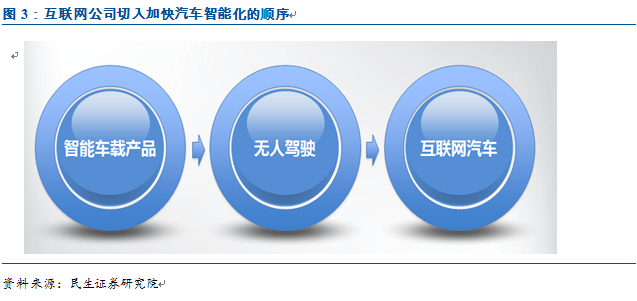 在汽车智能化的进程中,互联网公司起到引擎的作用。互联网的革命性发展对传统制造业产生巨大的冲击,在汽车4.0智能化的时代,互联网公司争前恐后的涌入这一领域。从国外的谷歌、苹果到国内的BAT三巨头以及乐视等互联网公司,都欲要大施拳脚。互联网公司成为进军汽车行业的先发力量,加快汽车智能化的步伐。我们认为,互联网公司进军汽车行业的主要方式是:重在依托原有自身优势的基础上,以车载智能产品、无人驾驶、互联网汽车生态系统构建(起步于战略合作阶段,后续产品陆续落地)三大方向为主要内容,多通过与传统车企的合作,积极推进汽车的智能化进程。