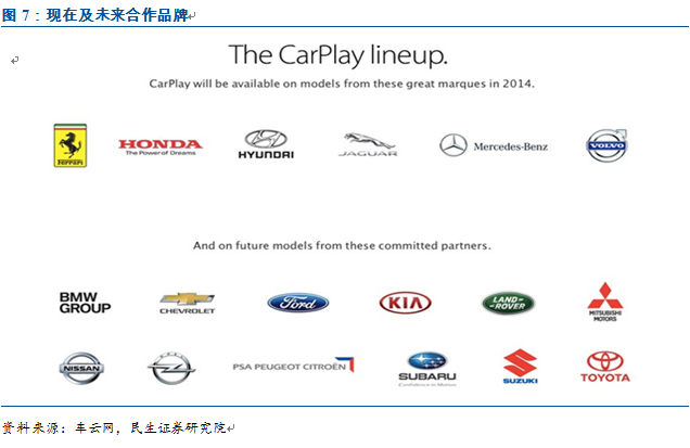2014年3月,苹果宣布推出车载系统Carplay,启动后,用户可以通过苹果Lightning接口把iPhone连接至车辆自带的车载娱乐系统当中。连接后,可通过触屏、旋钮以及语音三种方式控制包括打电话、发短信、播音乐以及及时导航等功能。据预测,首批支持CarPlay将是若干款豪华车,来自奔驰、法拉利和沃尔沃三家公司,此外,目前已与CarPlay实现合作的车企还包括宝马、丰田、通用汽车、本田、现代、捷豹路虎、起亚、三菱、日产、标志、斯巴鲁、铃木和福特等。