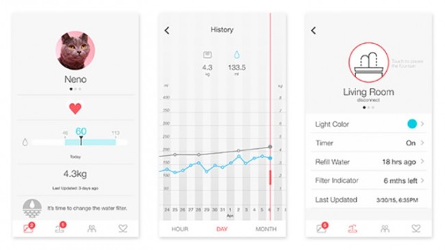 Pura 通过蓝牙向手机客户端传输数据,包括猫咪的饮水量、饮水次数和时间段,手机客户端可以生成图表数据并记录喵咪的饮水量和饮水习惯,如果饮水量过少可以通过通知提醒主人。