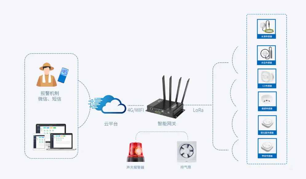 本案例采用智能网关配合多种传感器(水浸传感器、水位传感器、烟感传感器、一氧化碳传感器、硫化氢传感器、甲烷传感器)和远程测控终端的方案。传感器负责实时监测地下管廊内的水位、烟雾、有毒气体等多种安全风险指标,数据通过智能网关传输至中央监控室。监控系统根据数据分析结果,自动控制排气扇或声光报警器,及时响应各种环境安全问题。