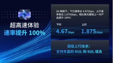 – SA网络峰值速率:下行5Gbps/上行1.875Gbps,相比上一代提升100%