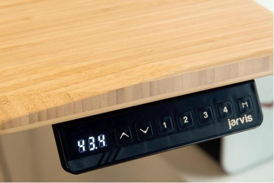 当然,Jarvis 电动办公桌的灵魂在于电动升降。在桌子右侧,可以找到一个控制面板,可实现62至128厘米的升降幅度,你可以使用上下按键自行调整,也可设定四个预设高度,使用数字按键快速调节。