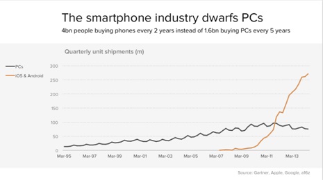 PC 供应链最终把零部件装到了一个价值500美元到1000美元的外壳里,而智能手机供应链能够以平均200美元的价格,甚至低至30到40美元的价格把这些 零部件装到尺寸小得多的外壳里,而且装上电池就能运行。现在人们不仅能用到更小、更便宜、低能耗的零部件,还能用到各种各样的新型传感器,这是PC永远用 不着的东西。这些零部件已经应用到了许多新产品,包括无人机、可穿戴设备、连网家用设备、物联网设备,智能电视机、联网汽车等。甚至卫星也可以使用得到。