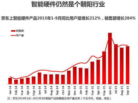 实际上,智能硬件行业仍保持高速发展。京东大数据显示,2015年1-9月,智能硬件产品用户同比增长212%,销售额增长284%。这个速度仍然令绝大部分行业望尘莫及。