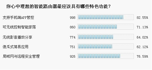 调查研究表明,有82.55%的网友希望智能路由可以实现手机端APP管控,76.59%的网友认为应实现局域网与远程的安全管理,71.13%的网友期望可通过无线来控制智能家居,还有64.02%的网友希望能够实现无线影音的播放分享,更有62.12%的网友期望智能路由拥有傻瓜式的简易应用。