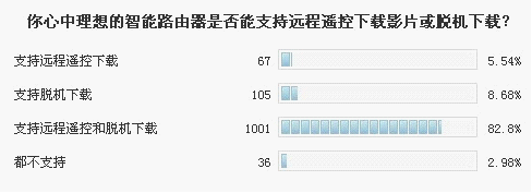 在随后展开的调查中发现,有高达82.8%的网友希望智能路由可以支持远程遥控下载影片或具有脱机下载的功能,明显对于视频的下载、传输需求还是很大的。