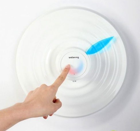 这款新式饮水机采用了壁挂式结构设计,可以直接悬挂在墙壁上,减少了地面空间的占用。圆盘上带有蓝色的指示条,每喝一杯水,就顺时针移动一格的位置。在操作方面,也是非常简单的。在圆盘中间,为触摸出水装置。只需要轻轻触摸一下,就可以接满一杯水。同时,还会在中间的LED显示屏显示出当前总计接了几杯水。