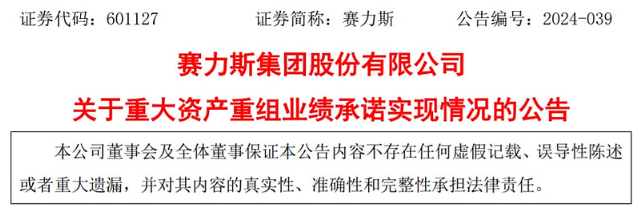 另外还有,此前赛力斯还披露《关于重大资产重组业绩承诺实现情况的公告》,表示还有个13亿多的业绩补偿!