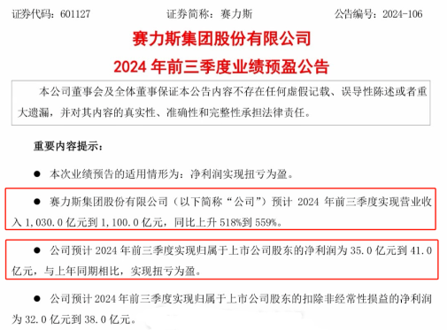 毕竟对于业绩补偿,会将直接减少赛力斯年度的净利润,从而对全年的利润表现产生负面影响。但是尽管面临业绩补偿的压力,赛力斯在2024年前三季度依然实现了显著的业绩增长,预计全年净利润将实现扭亏为盈。这表明赛力斯具有较强的市场适应能力和盈利能力,能够部分抵消业绩补偿带来的影响。