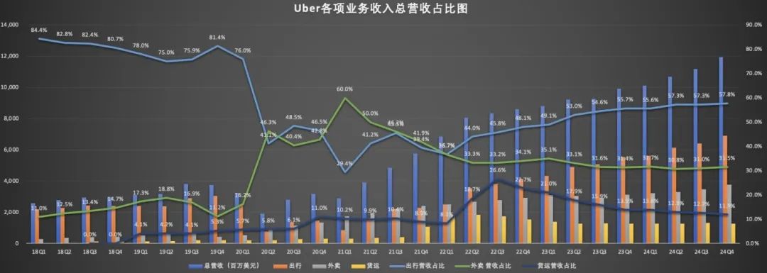 首席执行官Dara Khosrowshahi强调,自动驾驶技术的快速推进将降低人力成本并提升服务效率,成为长期增长关键。外卖业务增速放缓,但对收入的贡献保持稳定。四季度,外卖订单额201亿美元(同比+18%),收入37.73亿美元(同比+21%),虽增速低于网约车,但仍为第二增长曲线提供支撑。