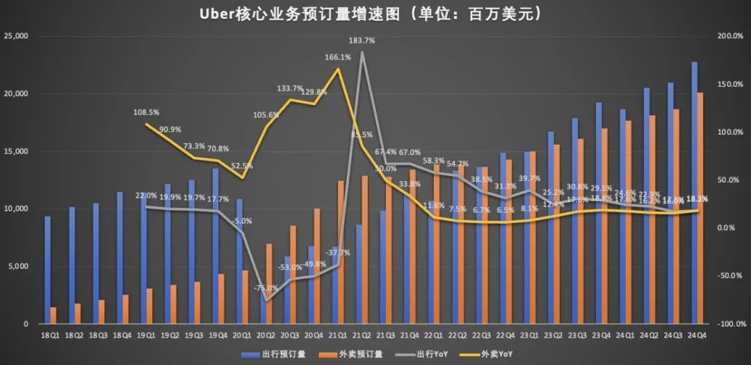 数据显示,优步第四季度营收119.59亿美元,同比增长20%;净利润68.83亿美元,同比增长382%。全年营收439.78亿美元,同比增长18%;净利润98.56亿美元,同比激增422%。优步收入增长主要受网约车和外卖业务双轮驱动。订单总额是非常重要的指标,2024年Q4,总预订量同比增长18%至442亿美元,较上个度增长2个百分点。其中,网约车业务(Mobility)实现了需求复苏与技术升级。财报显示,第四季度网约车订单额228亿美元(同比+18%,汇率调整后+42%),收入69.11亿美元(同比+25%),日均出行3300万人次,用户粘性增强。