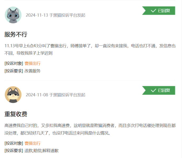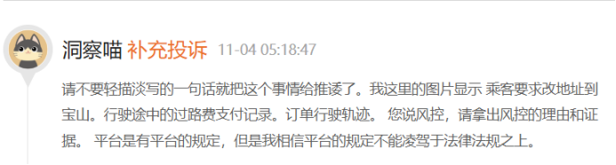 10月31日,有司机投诉并附上证据图片称,“本人于2024年10月16号下午15:54分接乘客订单,乘客发信息表示修改地址,后按照修改后地址把乘客送达目的地并结束订单,全程开录音,下车提醒乘客下车等语音信息,平台肯定有录音。后来发现平台把该订单定义为风控,不予以垫付车费和高速费合计179.41元(其中高速费9元),截止目前已经过去半个月了,该订单费用仍未到账。期间给平台打过电话,他们就一直推诿,说反馈高级专员处理。再次,希望曹操出行重新核实该订单属性,如拿不出证据,请按照合同约定垫付费用179.41元。”后续曹操出行在黑猫投诉做出了回应(已隐藏),但并未得到司机的认可。