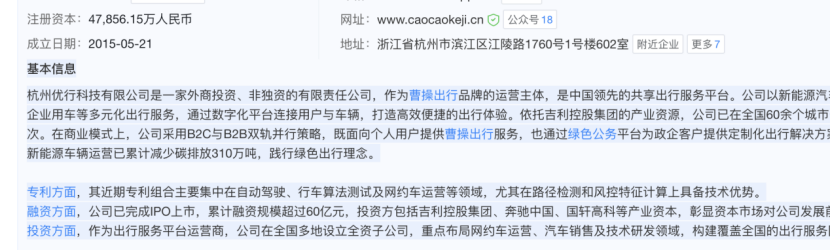 根据天眼查App显示,曹操出行成立于2015年,至今已经成立十一年。