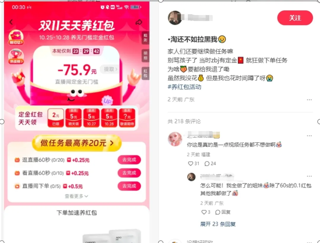 除了消费券之外,各种渠道的购物红包发放似乎也存在BUG,据《潇湘晨报》的报道,多位用户在社交平台吐槽,他们近日在参加点淘(原淘宝直播)的“天天养红包”优惠活动,花费了很多时间和精力,但最后红包页面出现负数。有网友质疑,这意味着自己还倒欠平台几十元钱。