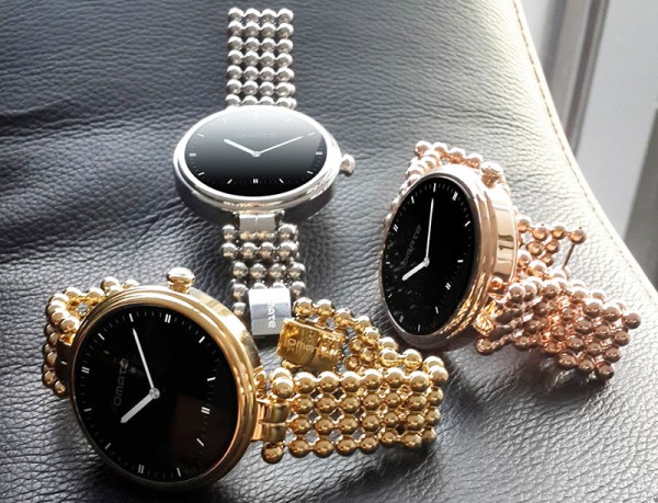 这款智能表采用半投射式LCD规格,即使是在Alcatel Wave上见到也是全时点亮的,从特定的角度看过去,你会发现他的玻璃上有着蔚蓝色如大海一般深邃的镀膜,这款智能表有三种颜色,神秘的银色,高贵的玫瑰金以及典雅的金色,表带采用高质感的珠串设计缠绕你的手腕。