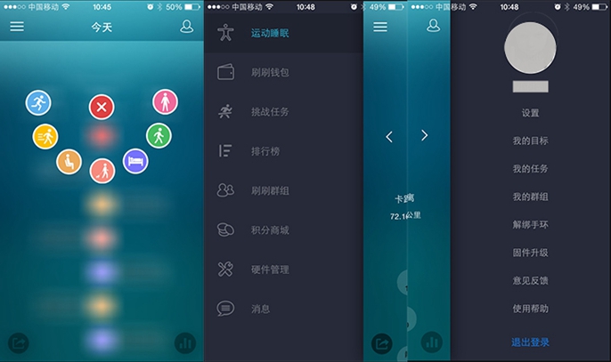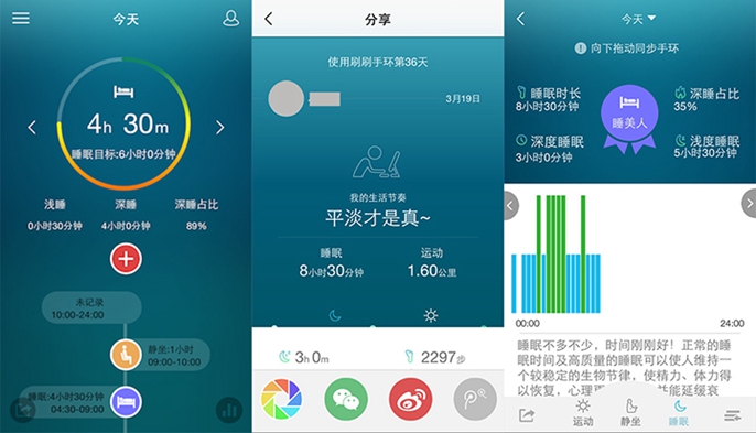 刷刷手环和目前大多数的手环一样,拥有记步,睡眠监测和运动分析三大功能。通过App用户可以记录自己一天内静坐、散步、走路、快走、跑步、睡眠和消费七种生活状态,十分人性化。