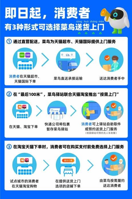 一是针对天猫超市和天猫国际订单,由菜鸟直送运输直达消费者。二是针对普通的淘宝天猫订单,由菜鸟驿站先暂存包裹,消费者预约菜鸟驿站送货上门。三是针对试点城市和提供送货上门服务的店铺,消费者在淘宝天猫购物后,菜鸟按需履约送货上门。