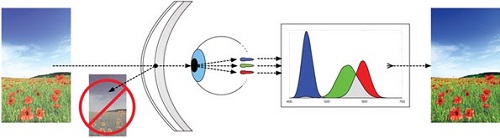 这些涂层的作用是对进入佩戴者眼中的光线进行干预,将红绿等颜色的光子基于不同的波长进行不同程度的过滤,放大特定的光波,让看到的颜色更为明亮饱和,从而达到增强色觉的效果。