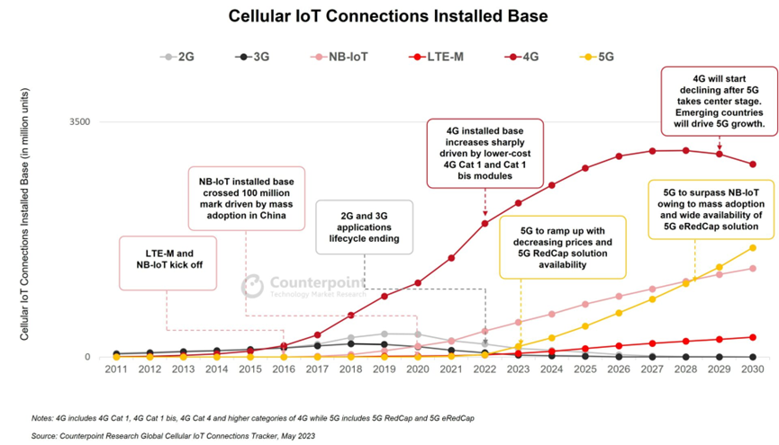 此外,Counterpoint还同样认为,5G RedCap和5G eRedCap的推出、模组单价下降以及更多基于5G RedCap的解决方案上市,将在推动5G大规模应用方面发挥关键作用,特别是在发展中国家和欠发达国家这一作用将更为明显,5G RedCap模组也将成为市场主流产品之一。从Counterpoint发布的各制式蜂窝物联网连接数走势图来看,2023年将是全球范围内5G相关模组起量的关键一年。