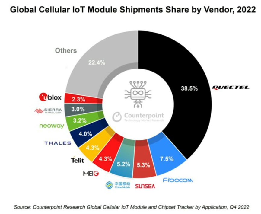 与IoT Analytics发布的基于收入的全球TOP5厂商相对应的是,另一家市场研究机构Counterpoint此前3月曾发布2022年基于出货量的蜂窝模组厂商排名。根据Counterpoint的数据,移远通信的出货量同样排在首位,公司同时实现了出货量和销售收入的市场第一。未分别算入锐凌无线和Thales之前,广和通和Telit的出货量份额分别位居第2和第6,合并之后,从收入的角度看,广和通保持第2,新Telit跃居至第3,相较而言,Telit和Thales的合并,短期内带来了更为显著的效益。Sierra Wireless 2022年的出货量位居第9,LG Innotek的出货量未进入TOP10,这也侧面反映出,两家公司或采取了优质优价的策略,反映到销售收入层面排名更为靠前。