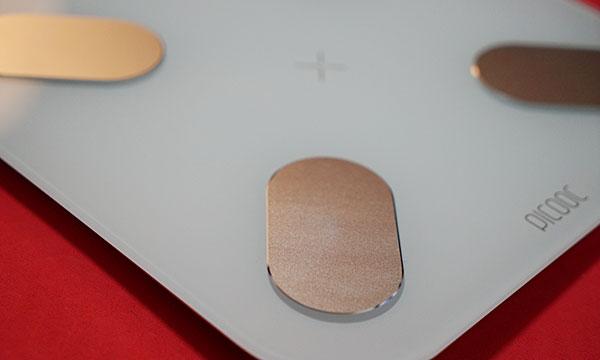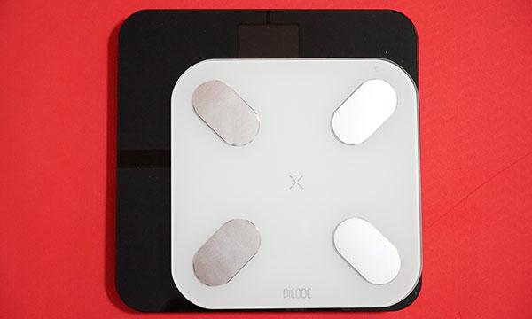 在玻璃面板上设置有4个合金感应片,这部分是用来导电的,有品官方称CQ可以通过“BIA生物电阻抗测量方法”测量用户的体重、体脂、肌肉率、基础代谢等9项身体指标,在用户站在秤上的时候,脚会自然站在这4个电极上,电极可以测量人体内微弱的生物电,通过肌肉、脂肪和骨骼不同的导电性分析,就可以得出以上数据了,具体的原理和公式我也不太明白,有品官方给出的解答也只是“通过有品PICOOC独家、核心的分析算法”。不过这种方式其实是目前世面上的同类产品都在使用的,所以起码数据肯定是可以参考的。