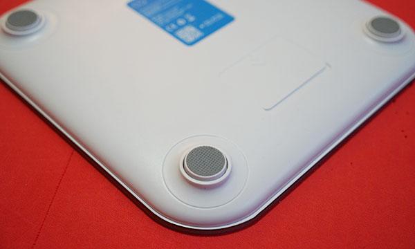 秤的底部四个角上的小圆垫儿是压感装置,这种设计受到地面条件的限制会比较大,必须放在硬地板上使用,否则会造成数据不准。