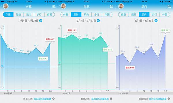 2、我一般是早上测量,刻意有一两天是晚上测量的,数据上果然有一定的差距,所以如果真的是在减肥中,固定时间测量很重要;