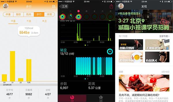 有品的应用中还额外加入了减肥社区、朋友运动排行等附加功能,有时候看看里面的文章,也对科学减脂有所帮助。不过奇怪的是,虽然我已经绑定了有品应用和苹果健康,但是这个应用中调用的运动数据似乎不是我的Apple Watch的,而是手机本身的运动数据,下图可以看出同一天两个应用中的数据有很大的差别,鉴于我健身的时候一般不带手机,都是只带着手表的,数据上的差距其实还是挺麻烦的。