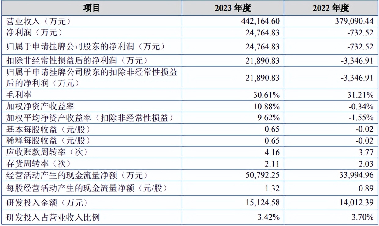 反馈在业绩上,增长趋势较为显著。2022-2023年,公司实现营收分别为37.91亿元、44.22亿元,归母净利润分别为-732.52万元、2.48亿元。