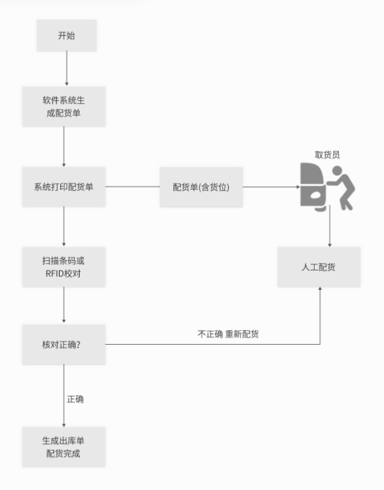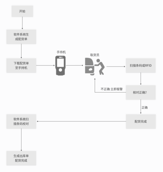 首先,在现有系统建立了SKU库位定义功能,方便查询每个SKU的位置。在此基础上,斯科提出更先进的配货方法,即通过RFID手持机进行动态配货,配货员在ERP系统中新建配货单后,通过打印配货单(包含货位信息)或直接将配货单下载到RFID手持机上进行动态配货,无需打印纸质配货单,节约资源,环保。如下图: