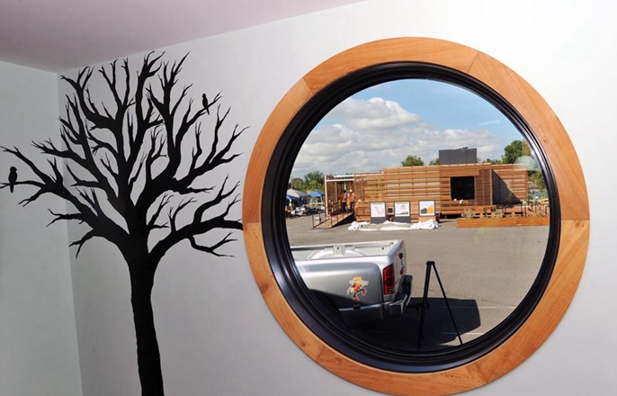 当地时间2015年10月5日,密苏里科技大学团队展出了建造的房屋。房屋内部有一个圆形的窗户,可以独特的视角看到加州理工大学设计房屋的入口。