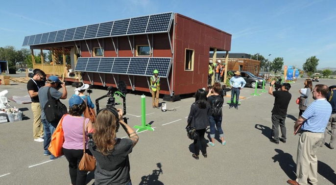 美国能源部两年一度的太阳能十项全能竞赛在加州的尔湾市举行,图为众多记者围绕在纽约城市大学城市学院学生设计和建造的紧凑型、可堆叠房屋前拍照。