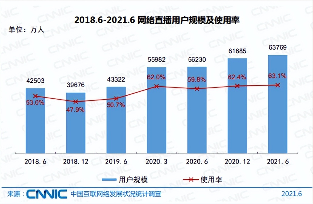 中国互联网络信息中心数据显示,截至2021年6月,我国直播用户规模达6.38亿,占网民整体的63.1%。其中,电商直播用户规模为3.84亿,占网民整体的38.0%。直播消费融入日常生活后,职业主播人数迅速上涨。数据统计,在更早的2020年,中国网络表演(直播)行业主播账号就超过了1.3亿,其中日均新增主播峰值为4.3万人。