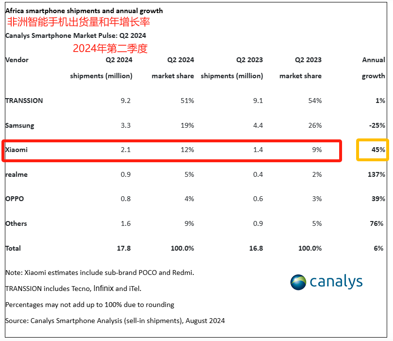 所以,在海外市场的“攻城略地”,小米表现尤为突出。在印度、拉丁美洲、东南亚、中东和非洲等地区,红米系列凭借其高性价比策略,抢占了大量市场份额。特别是在非洲,小米的2024年Q2季度的市场份额12%,同比增长45%。小米全球第三国产第一,远远领先其它国产品牌…