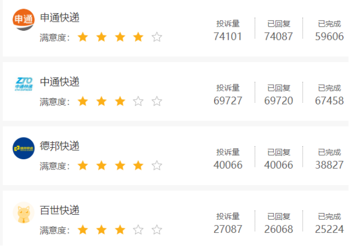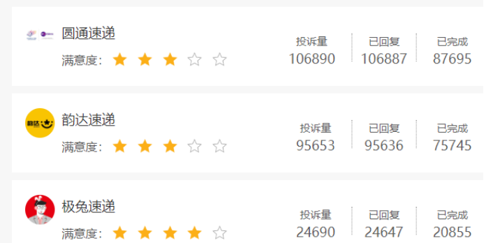 《港湾商业观察》查询黑猫投诉平台发现,各快递公司的投诉量普遍都在数万条不等,比如中通快递投诉量有6.9万条,已完成6.7万条;圆通速递投诉量有10.69万条,已完成8.77万条;韵达速递投诉量有9.56万条,已完成7.57万条;申通快递投诉量有7.41万条,已完成5.96万条;德邦快递有投诉量4.01万条,已完成3.88万条;顺丰速运投诉量有9.96万条,已完成8.93万条;京东物流投诉量有11.86万条,已完成9.47万条;极兔投诉量有2.47万条,已完成2.09万条。