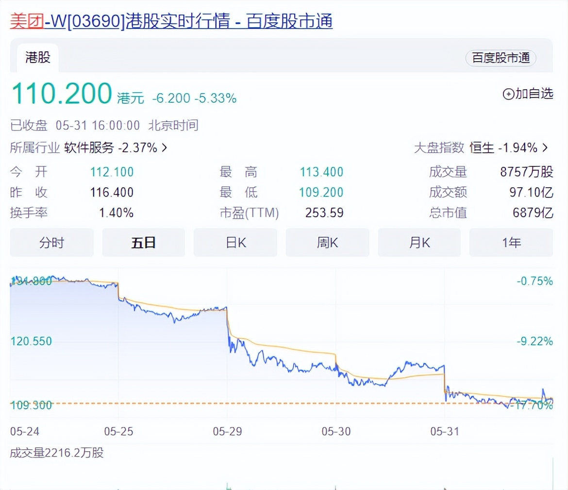 自其发布财报以来,美团二级市场已从5月25日128.90港元/股的开盘价,下跌至5月31日收盘时的110.20港元/股。哪怕不与2021年460港元/股最高点相比较,相较今年年初美团的股价还在170港元+/股,也有一定差距。