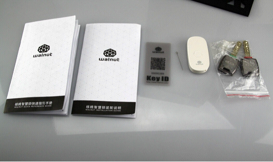 这里是包装里所有的配件,总共有九样,分别是核桃智能锁主体两个,钥匙扣一个,钢针一枚(重置门锁和钥匙扣专用,贴心),传统开门钥匙两把,配置钥匙二维码卡片一张,装配说明书一本,使用手册一本。