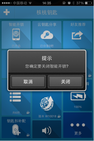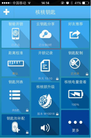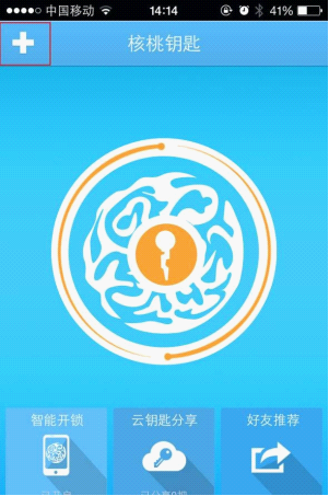 我们点击左下方扫描二维码按钮,然后扫描配件中二维码卡片上的二维码后,就可以配置好核桃锁的钥匙啦,是不是很简单方便?然后我们就可以进入主界面(如下图)。