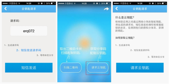 其中要重点介绍的是云钥匙分享功能,我们有时候碰到这种情况,亲戚朋友到访或者其他什么事需要开门,而家里又没人时会很麻烦。但核桃智能锁这个云钥匙可以帮我们轻松解决这个问题。只要到访的人手机里下载了核桃智能锁APP,我们就可以把钥匙短期内分享给他们。首先他们点击左上角的加号按钮进入钥匙配置页面,然后点击右下角(下右图)的请求云钥匙按钮,按照步骤把请求短信发到你的手机。